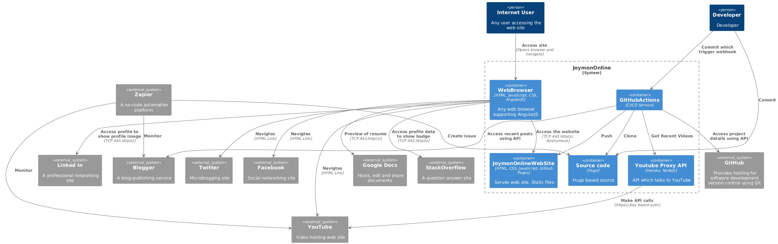 Now coming to the subject of this post. Below goes the container diagram of the website. Note that it includes some details of CI/CD pipelines as the Jamstack requires the static site to serve to have all the data that needs to be fetched and merged at the time of compilation.